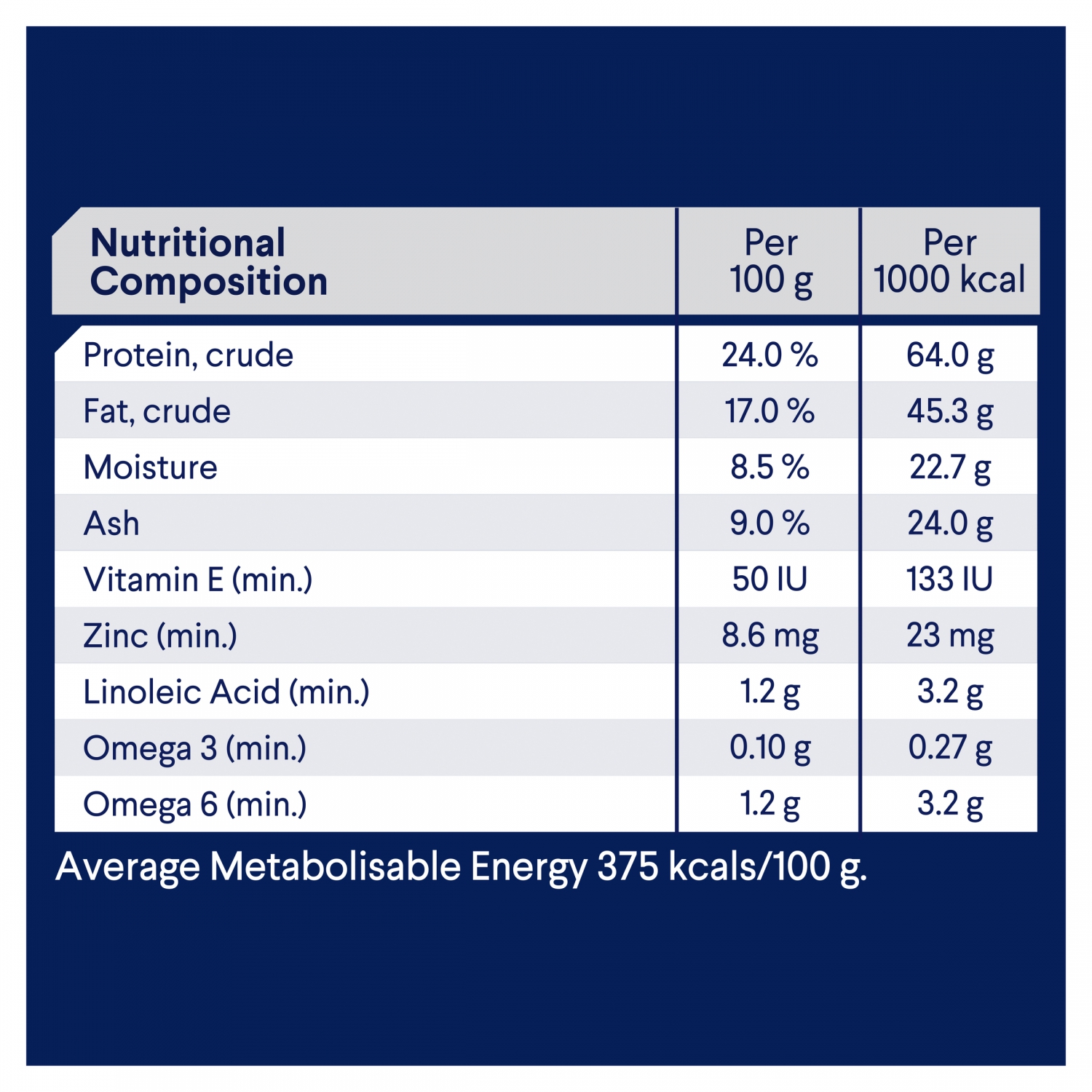 Ash 9.0%; Linoleic Acid (min.) 1.2g/100g.