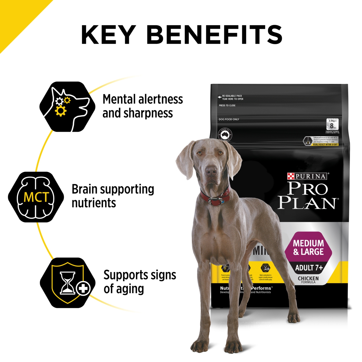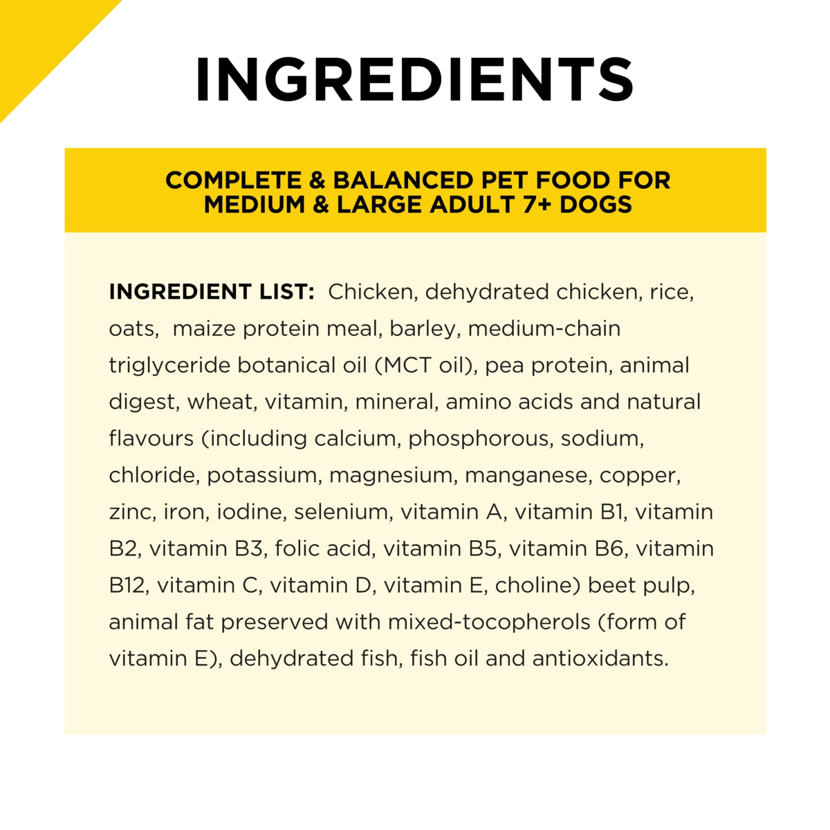Chicken, dehydrated chicken, rice, oats, maize protein meal, barley, medium-chain triglyceride botanical oil (MCT oil), pea protein, animal digest, wheat, vitamin, mineral, amino acids and natural flavours (including calcium, phosphorous, sodium, chloride, potassium, magnesium, manganese, copper, zinc, iron, iodine, selenium, vitamin A, vitamin B1, vitamin B2, vitamin B3, folic acid, vitamin B5, vitamin B6, vitamin B12, vitamin C, vitamin D, vitamin E, choline) beet pulp, animal fat preserved with mixed-tocopherols (form of vitamin E), dehydrated fish, fish oil and antioxidants.