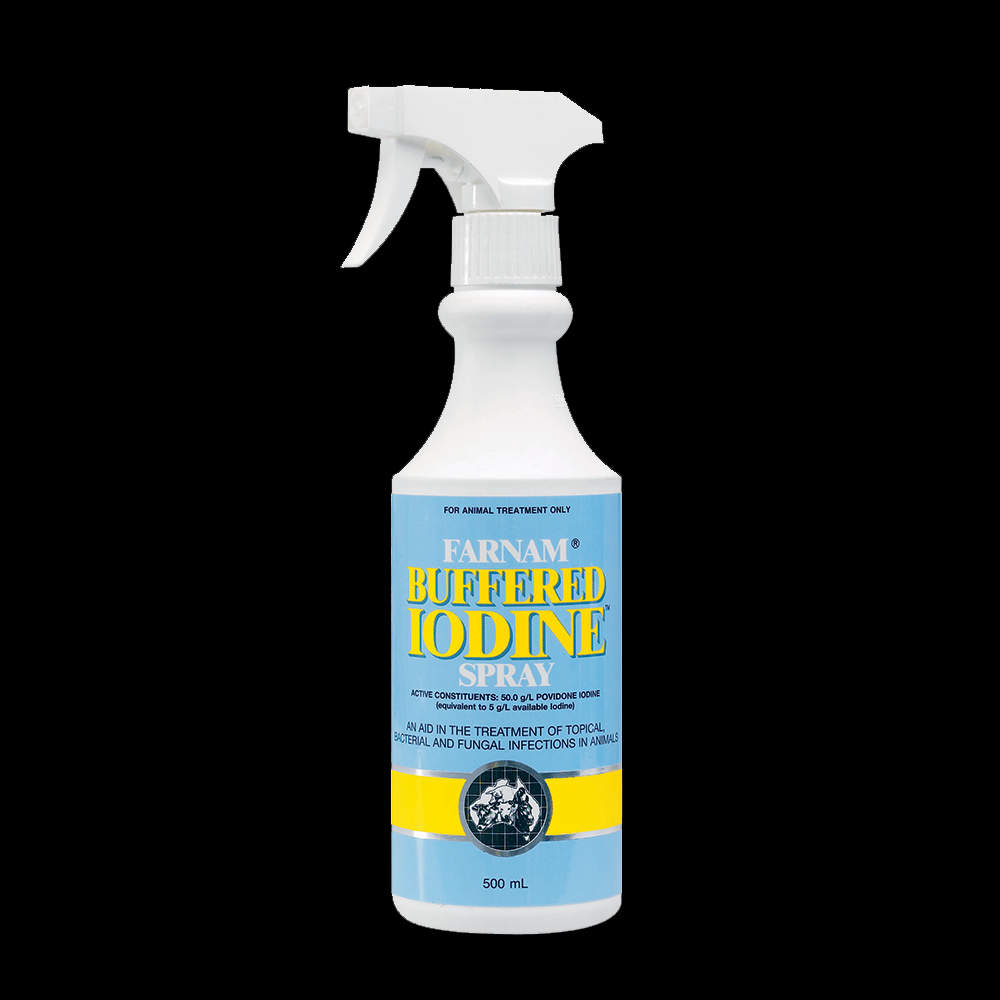 A safe and effective topical spray suitable for general antiseptic purposes on the skin of most animals. It can be used to control topical infection of the skin, keeping wounds dry and covered with a protective residue film of iodine to provide prolonged activity. BUFFERED IODINE SPRAY may be used in numerous surgical procedures and as a topical agent for various dermal and mucosal infections such as wounds, cuts, abrasions, burns, ringworm, navel disinfection in newly born animals, castration and docking wounds, udder wounds and cut teats.